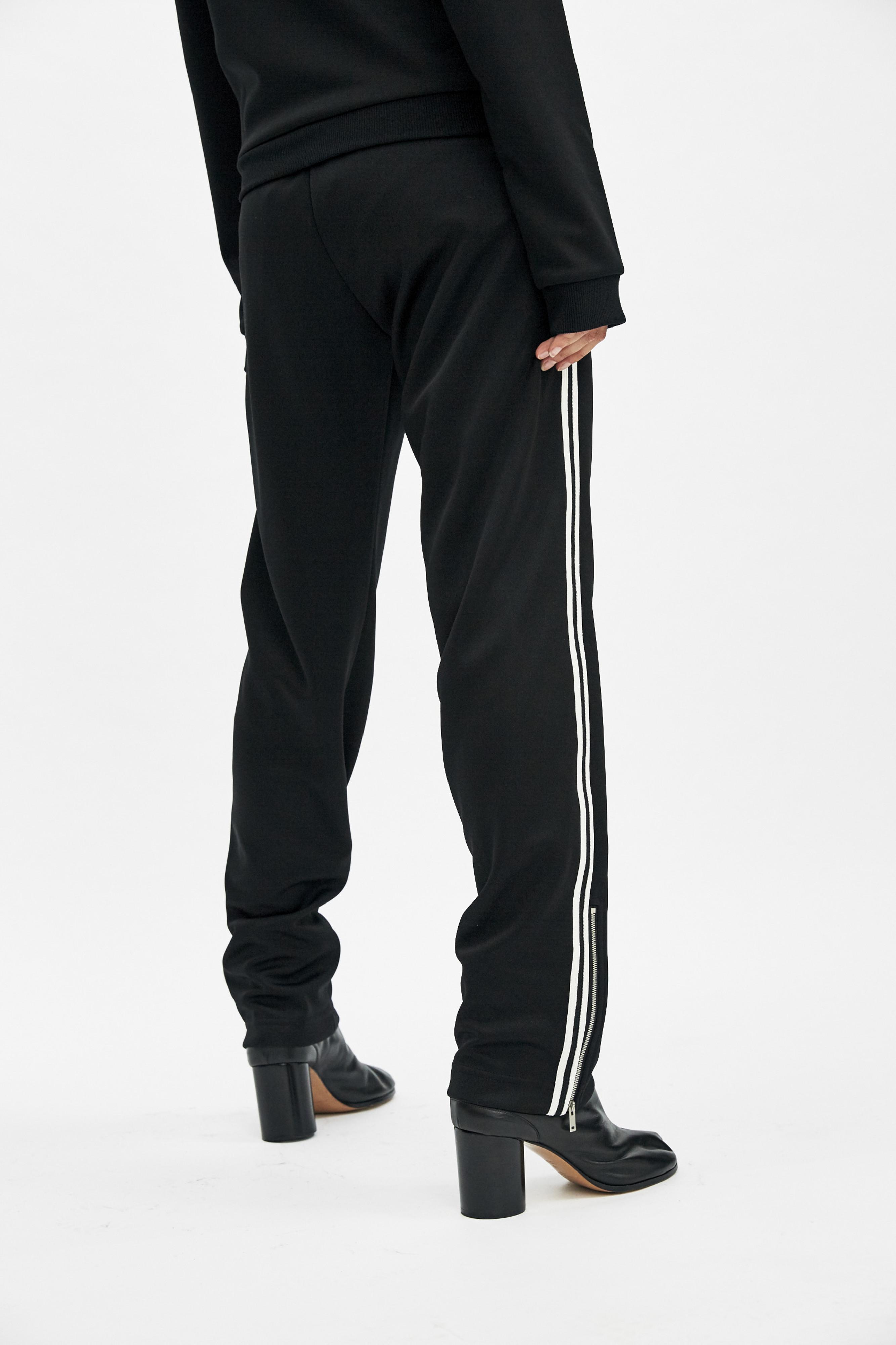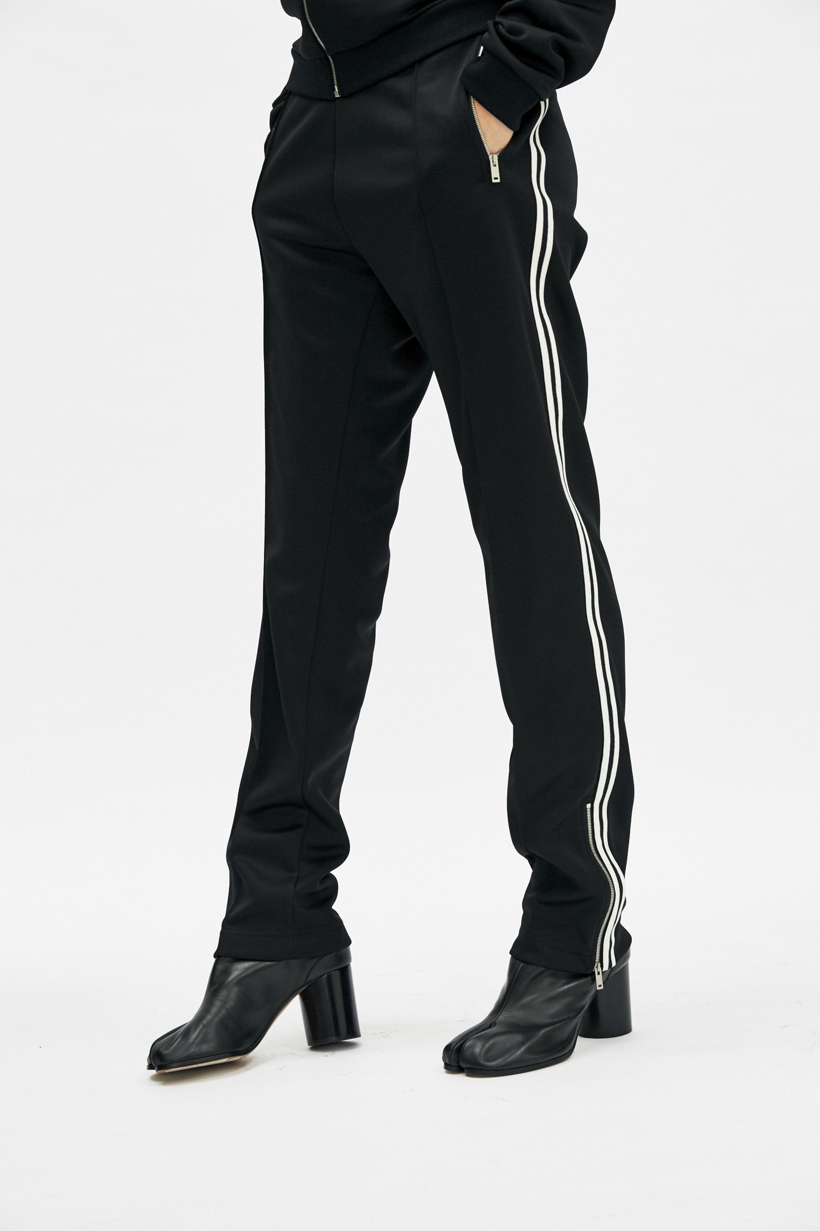 Black tracksuit trousers from Maison Margiela's A/W 17 collection. The trackpants feature contrast stripe detailing, stretch waist band, two side zip pockets, and are finished with zips on the ankles. Olive is 5'7" / 170 cm and is wearing size 48. 100% Polyester. Made in Italy. Colour: black