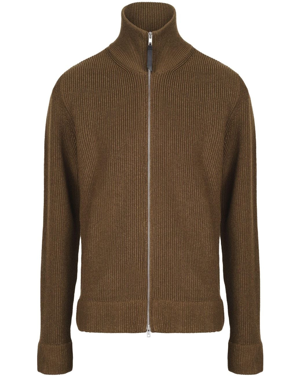Olive green cotton-wool blend/calf leather ribbed knit high neck long sleeves straight hem  . Colour: brown