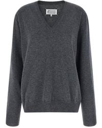 Maison Margiela's turtleneck crafted in blue wool knit with Work-in-progress stitches. It features high neck, long sleeves, ribbed edges and straight hem. The design is completed by the iconic four stitches on the