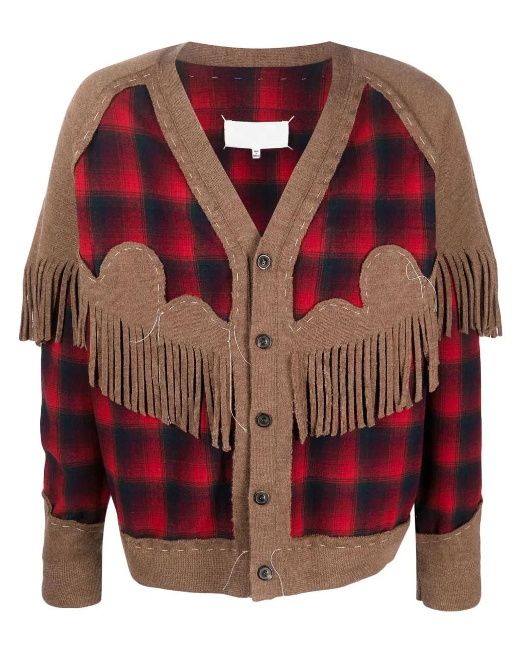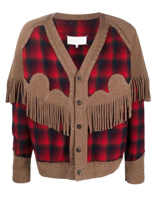 Rose red/black/camel brown wool panelled design knitted panels plaid check pattern fringe detailing signature four-stitch logo logo patch to the rear V-neck front button fastening long sleeves straight hem Size: XS. Gender: Male. Material:Viscose/Wool.