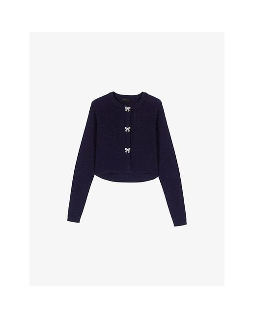 Maje wool cardigan100% woolExposed button fastening at frontRegular fit, round neck, long sleeves, bow embellished buttonsHand washTrue to sizeMidweight, non- stretch Colour: blue