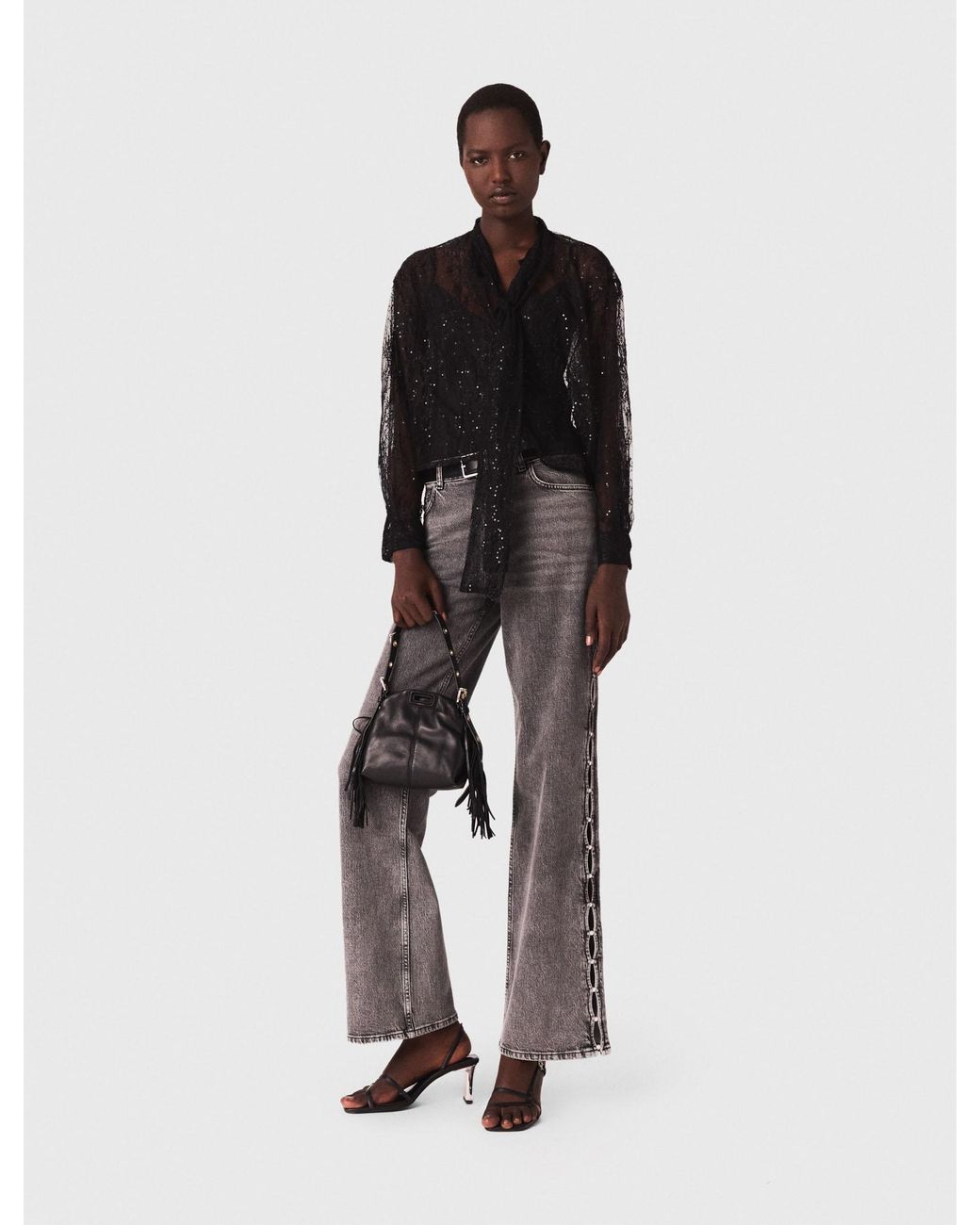 Sheer sequinned lace pussy-bow shirt Removable camisole Long sleeves and a tie-neck pussy-bow collarThis new season, Maje is reinventing the wardrobe with characterful pieces in unexpected materials. Discover a piece of bold elegance, designed to shine throughout the seasons. This lightweight shirt plays on the contrast between the sheerness of the lace and the discreet sparkle of the sequins. Wear it alone or layered, to add a twist to your denim or make an evening outfit shine, and finish the Colour: black