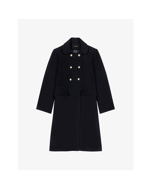 Maje wool-blend coat72% wool, 28% polyamideExposed button fastening at frontRegular fit, collared, long sleeves, double breasted, gold-tone hardware, two pockets at the sideDry cleanTrue to sizeMidweight, non-stretch Colour: black
