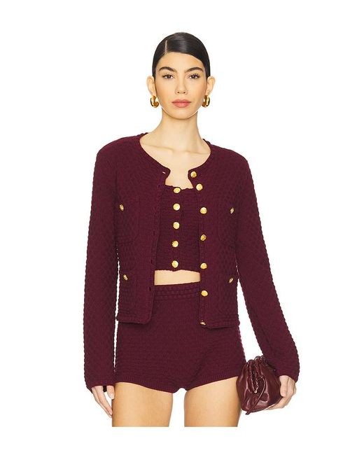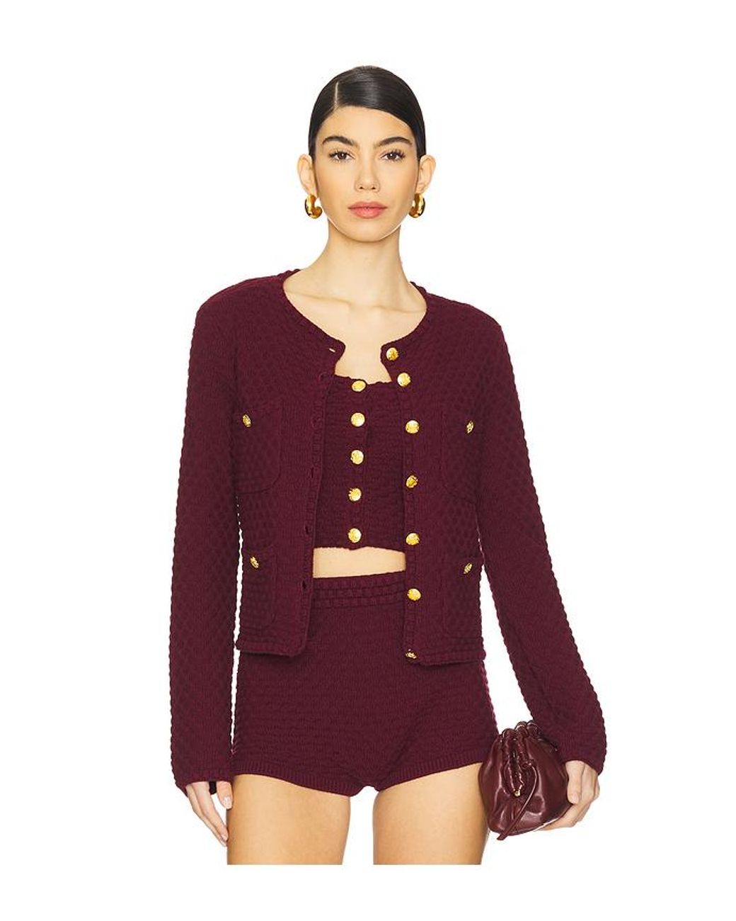 MAJORELLE Evaline Cardigan in Burgundy. Size XS. Also in XXS. MAJORELLE Evaline Cardigan in Burgundy. Size XXS. 100% cotton. Made in China. Dry clean only. Front gold-tone button closure. Breast and side pockets. Midweight knit fabric. Item not sold as a set. MALR-WK292. MJK251 F24. Majorelle is a romantic escape driven by a sense of wanderlust and effortless feminine appeal. Based in Los Angeles, the label is girly, flirty, vintage and romantic, perfectly blending elegant dressing for the luxe dreamer who loves to travel the world.
