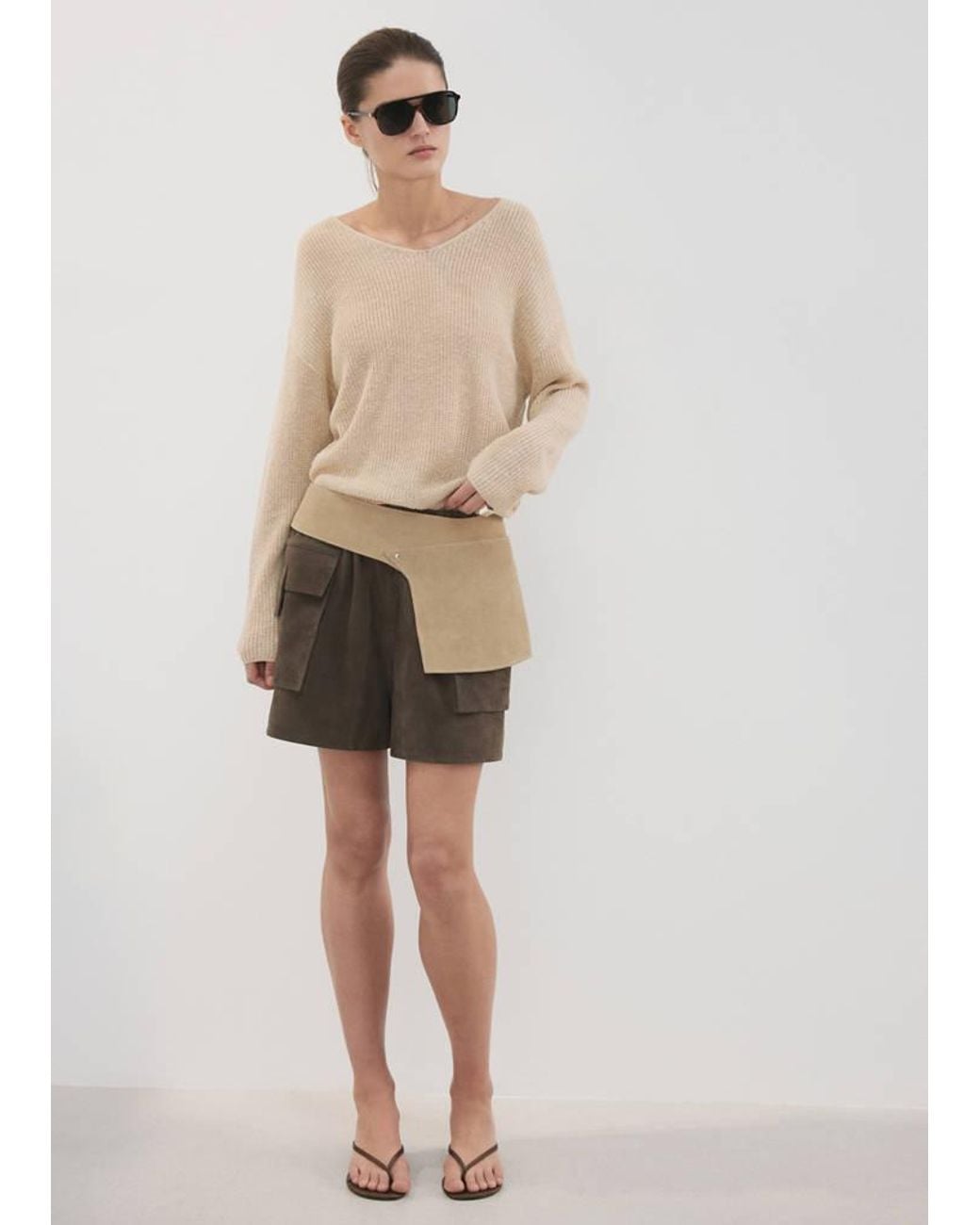 V Neck Knitted Jumper With Scarf Detail - Brown