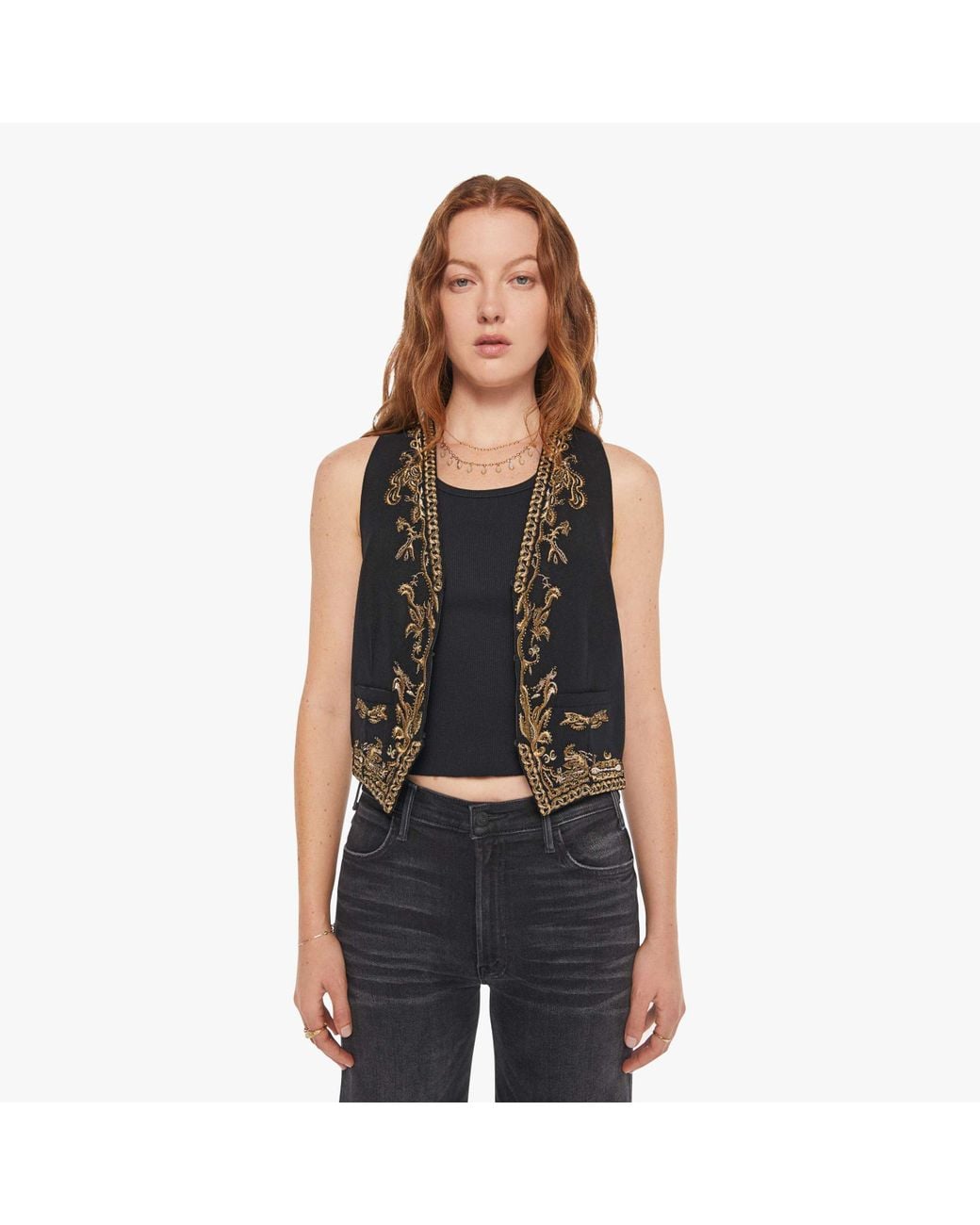 Vested interest. A vintage-inspired vest from Maria Cher, an Argentinian brand defined by bold prints and modern neutrals. Made from 100% cotton in black with gold embroidered details, the Selena vest features a deep V-neck, buttoned closure, slit pockets, a V-shaped hem and slightly shrunken fit. From Buenos Aires with love. Imported. Style No. T2865-611-BLK Maria Cher Selena Vest - Black Colour: black