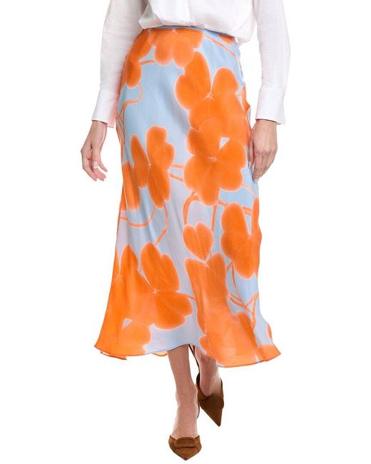 About the brand: Bold and unique prints, paralleled by none. Ekspressio Maxi Skirt in blue and orange with scallop hem, and elastic waist Approximately 39in from waist to hem Model is 5'10.5 and is wearing a size small. Measurements may vary slightly by size. Slip-on styling 100% cupro Machine wash Imported Colour: orange