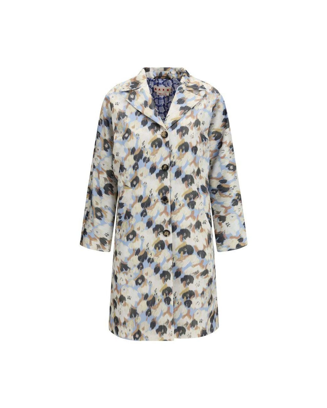 The printed button parka Coat by Marni stands out for its creative and contemporary design. Featuring a floral print, it has a cocoon silhouette that adds volume and movement. The style is completed with a lapel collar, front button closure, and a reversible construction, offering versatility and distinctive style. Season: SS26Fit: RegularComposition: 100% Polyester. Colour: blue