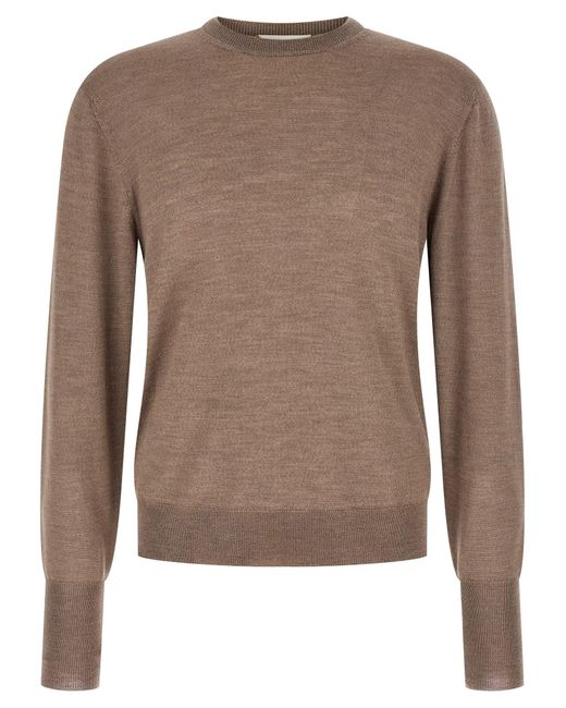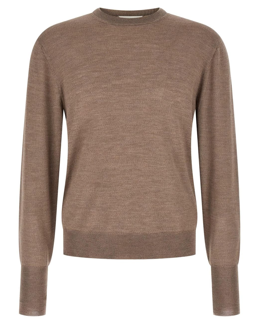 Merino wool, silk and cashmere jumper with fine knit, crew neck, long sleeves with wide cuffs with thumb opening and dropped shoulder, side slits on the hem. Composition: 70% wv, 20% se, 10% ws Colour: brown