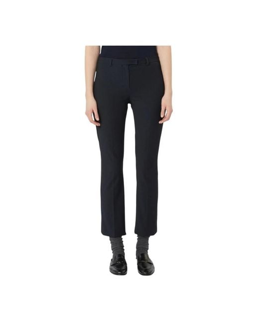 S Max Mara Umanita Cropped Trousers combine a tailored silhouette with a slightly flared hem for a polished, contemporary look. They are designed as a versatile wardrobe staple for smart-casual and office outfits. Key attributes: Black | Cotton | Stretch fabric | Zip fly with hook-and-bar closure | Wide waistband tab | Belt loops | Sewn darts at back waist | Slightly flared hem | Pressed crease on the leg | Cropped above ankle | Tailored construction | Dimensions & fit: Slim fit | High waist | Cropped length (above ankle) | Composition & care: 52% cotton | 41% polyamide | 7% elastane | Machine wash cold delicate cycle; do not bleach; do not tumble dry; line dry in shade; cool iron; professional dry clean (perchloroethylene, mild process); wash garment fastened; do not iron buttons; contains non-textile parts of animal origin. Colour: blue