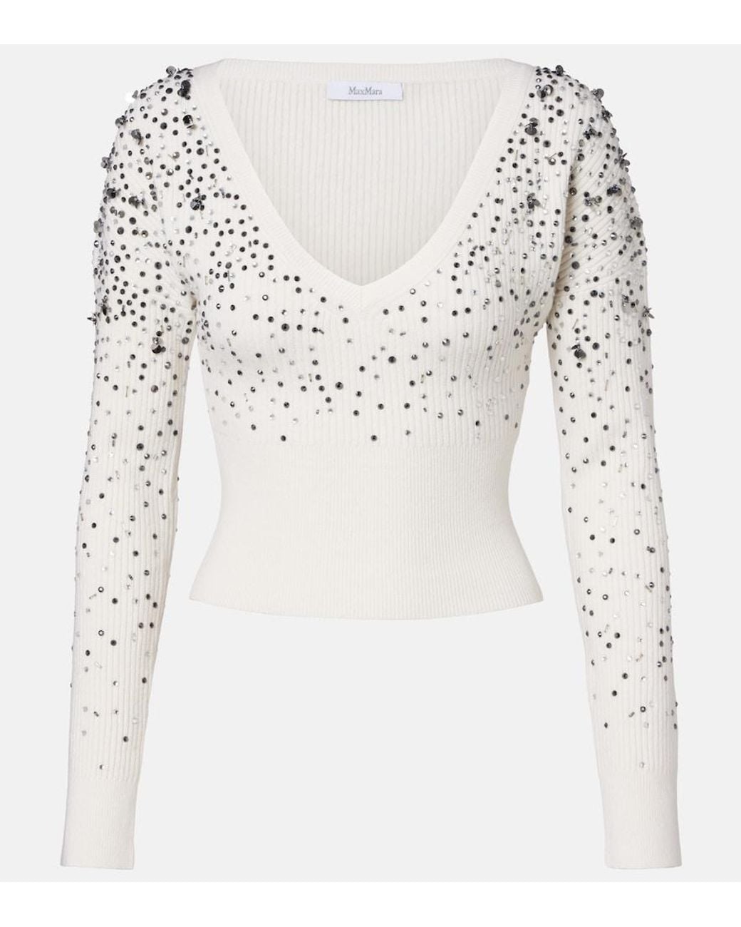 Cropped Embellished Ribbed Wool-Blend Jumper - Natural