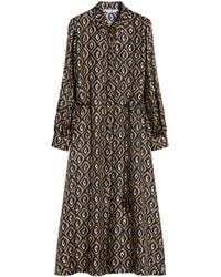 Go to FashdesLong caftan-style dress with belt to highlight the silhouette. Printed pure silk twill dress Straight cut Mandarin collar Set-in three-quarter sleeves with small slit at the cuffs Concealed front fastening Yoke cut with
