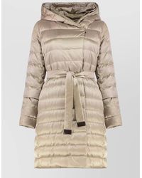 Go to BalardiStraight-cut midi down jacket in water-repellent technical fabric, quilted with horizontal stripes, with drawstring hood and welt pockets. - Long sleeves and elasticated cuffs with toggles - Two-way zip fastening - Welt pockets