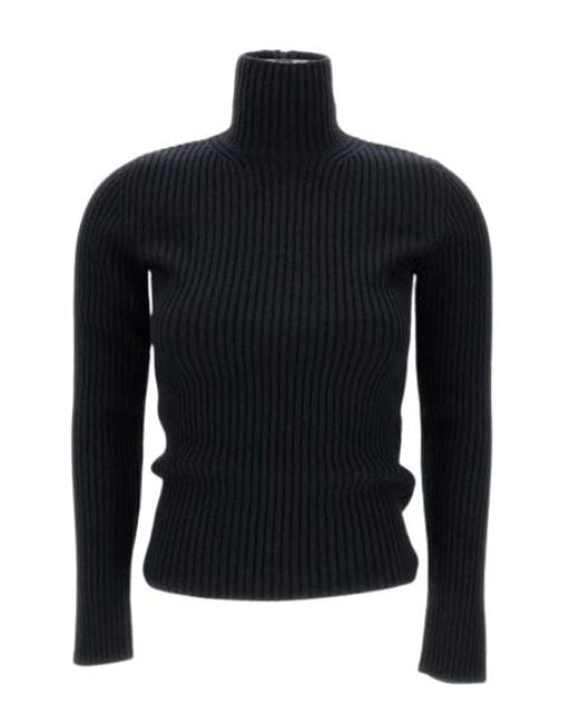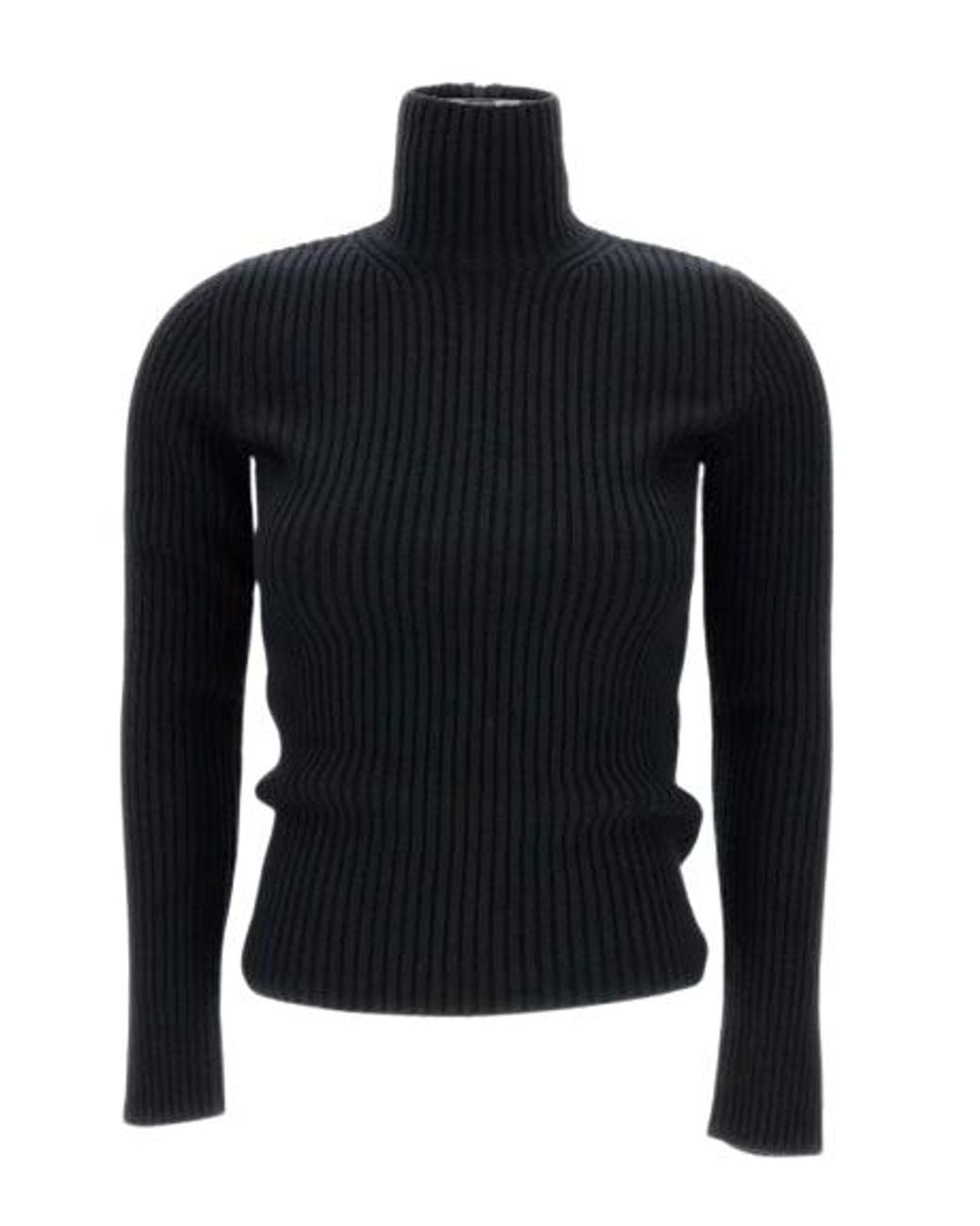 Ribbed-knit turtleneck jumper in black with a slim, body-skimming silhouette. Features a high rolled turtleneck collar and long sleeves. A short zip closure is visible at the centre back of the neck, with a small branded zipper pull. Colour: black