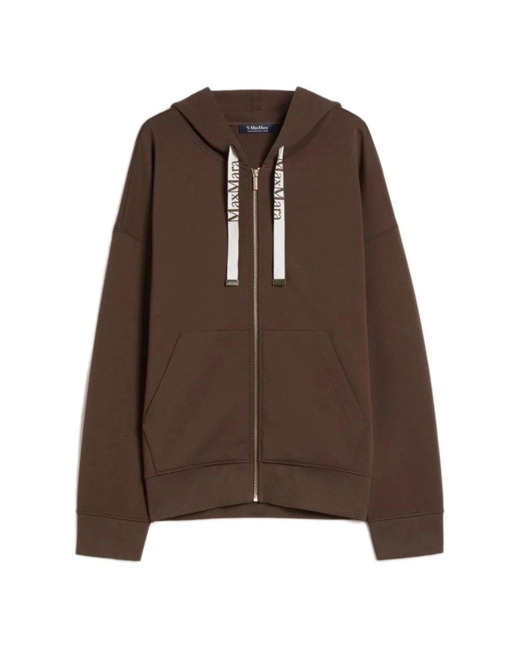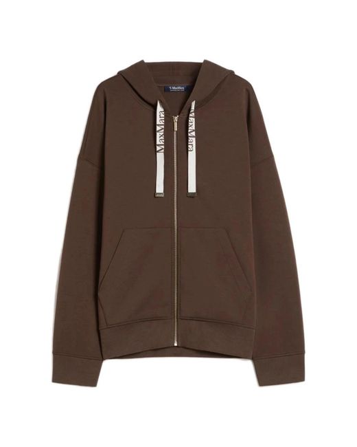 Max Mara Zip-through Jumper pairs a boxy silhouette with practical details for everyday layering. The front zip and kangaroo pocket make it a versatile midweight piece for casual outfits. Key attributes: Brown | Cotton | Front zip fastening | Kangaroo front pocket | Rib-knit cuffs and trim | Boxy silhouette | Long low set-in sleeves | Rib-knit trim | Dimensions & fit: Boxy fit | Model is wearing size S | Composition & care: 78% cotton, 22% polyester Colour: brown