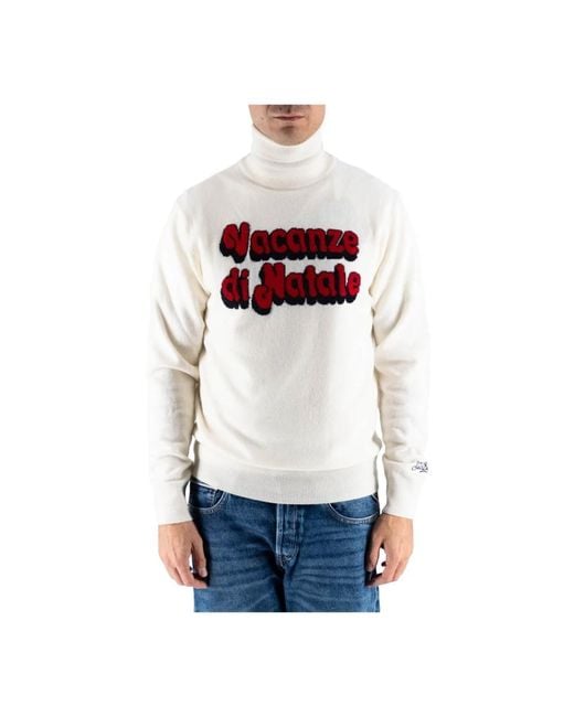 MC2 Saint Barth Vacanze di Natale Turtleneck is a wool-cashmere knit that combines refined warmth with a distinctive embroidered slogan. Its cream base and ribbed high collar make it ideal for winter holidays and elevated casual looks. Key attributes: White | Bianco | Wool-cashmere blend | Soft | Warm | Comfortable | Versatile for casual and dressy occasions | Easy to layer | High turtleneck collar | Ribbed trims | Red embroidered 'Vacanze di Natale' script | Dimensions & fit: Regular fit | Composition & care: Wool | Cashmere Colour: white