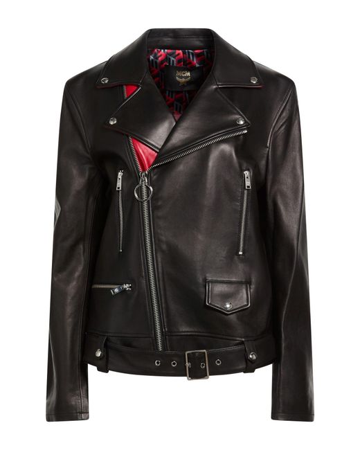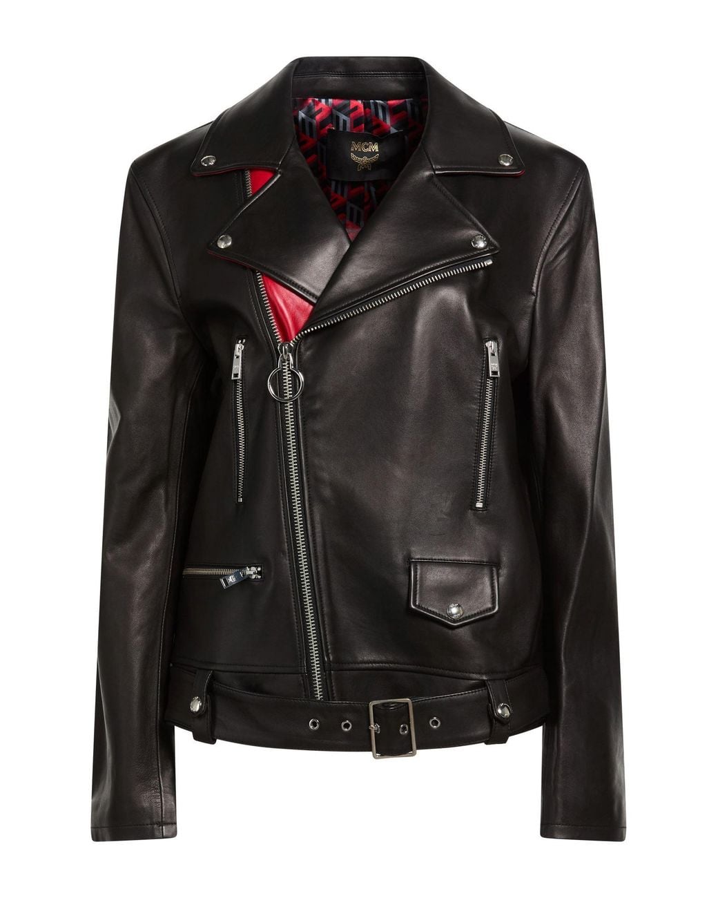 MCM. biker jacket, leather, plain colour, no appliqués, lapel collar, long sleeves, fully lined, zip fastening, zipped pockets, contains non-textile parts of animal origin, dry clean, do not bleach, do not tumble dry. 100% Lambskin.