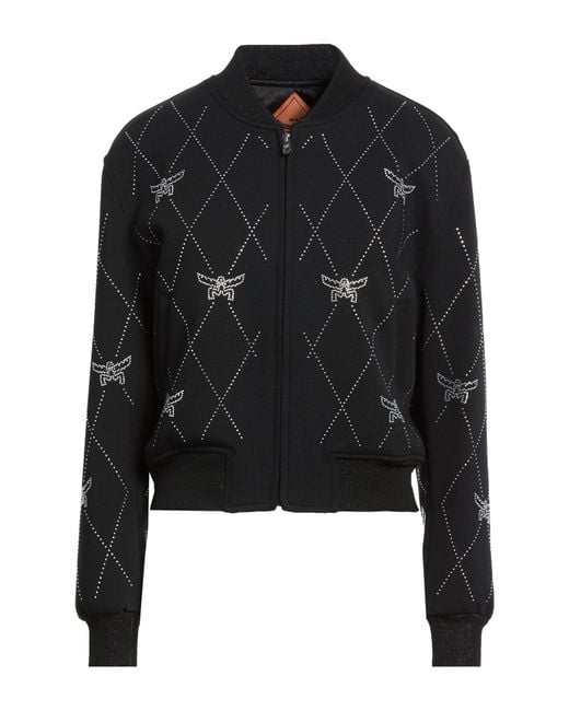 MCM. bomber jacket, jersey, stretchy fabric, plain colour with appliqués, knitted trims, crystals, long sleeves, synthetic filling, lightweight padding, zip fastening, slit pockets, hand wash, do not bleach, do not tumble dry. 52% Polyester, 41% Cotton, 7% Elastane.