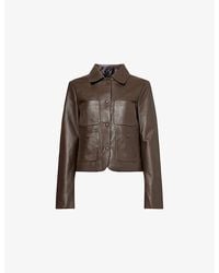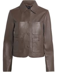 Go to ME+EMME+EM's Green Leather Varsity Bomber Jacket is granted a luxe update in supple khaki leather, then edged with striped ribbed monochrome trims for a sporty finish. Shop now. Colour: green