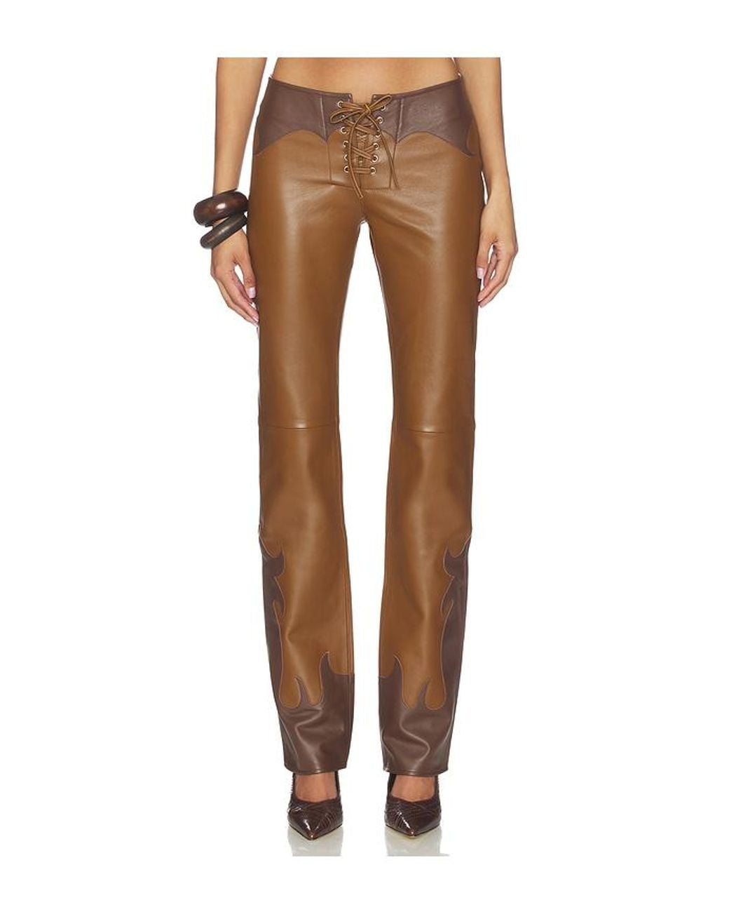 Miaou Element Pant in Brown. Size L. Also in M, S, XS. Miaou Element Pant in Brown. Size M, S, XS. 100% genuine leather. Made in China. Professional leather clean only. Front lace-up tie closure. Lightweight leather fabric. Pocketless design. 15 at the leg opening. MAOU-WP74. 1022RLWBR. Miaou is a collection of women's ready-to-wear popularized by designer Alexia Elkaim's coveted high-rise denim with a universally-flattering fit. Inspired by vintage flea market finds and 90's glam supermodels, Miaou brings in the effervescence of Paris, the casual chicness of New York, and the cool factor of Los Angeles - all cities where Elkaim was raised. The collection balances playful prints, sexy tailoring and mid-century French bombshell aesthetics for a hip and youthful retro-romantic vibe.