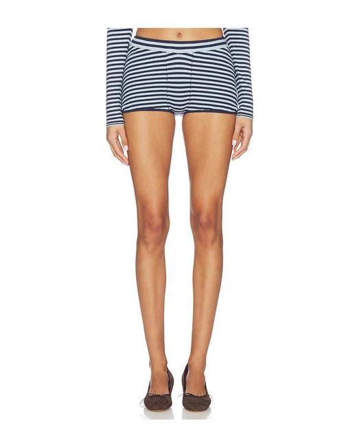 Miaou Emilia Short in Blue. Size L. Also in XS, S, M, XL. Miaou Emilia Short in Blue. Size XS, S, M, XL. 51% viscose 21% nylon 28% polyester. Made in China. Dry clean. Pull-on styling with elastic waistband. Zipped pocket at back. Midweight ribbed knit textile. Item not sold as set. Shorts measure approx 9.5 in length. MAOU-WF24. 3015SKRBST. Miaou is a collection of women's ready-to-wear popularized by designer Alexia Elkaim's coveted high-rise denim with a universally-flattering fit. Inspired by vintage flea market finds and 90's glam supermodels, Miaou brings in the effervescence of Paris, the casual chicness of New York, and the cool factor of Los Angeles - all cities where Elkaim was raised. The collection balances playful prints, sexy tailoring and mid-century French bombshell aesthetics for a hip and youthful retro-romantic vibe.