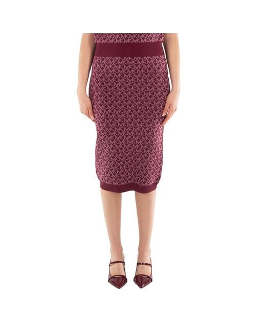 Michael Kors Ladies Bottoms. Fashion category: Skirts. SKU: MH1703D5KZ-642. Color: Red. Michael Kors Logo Jacquard High-Waisted Skirt. This skirt features a recycled viscose blend with a jacquard logo motif, a high-waisted design, a straight hem, and a mid-length cut. Recycled Viscose 62%, Nylon 20%, Polyester 14%, Elastane 4%.