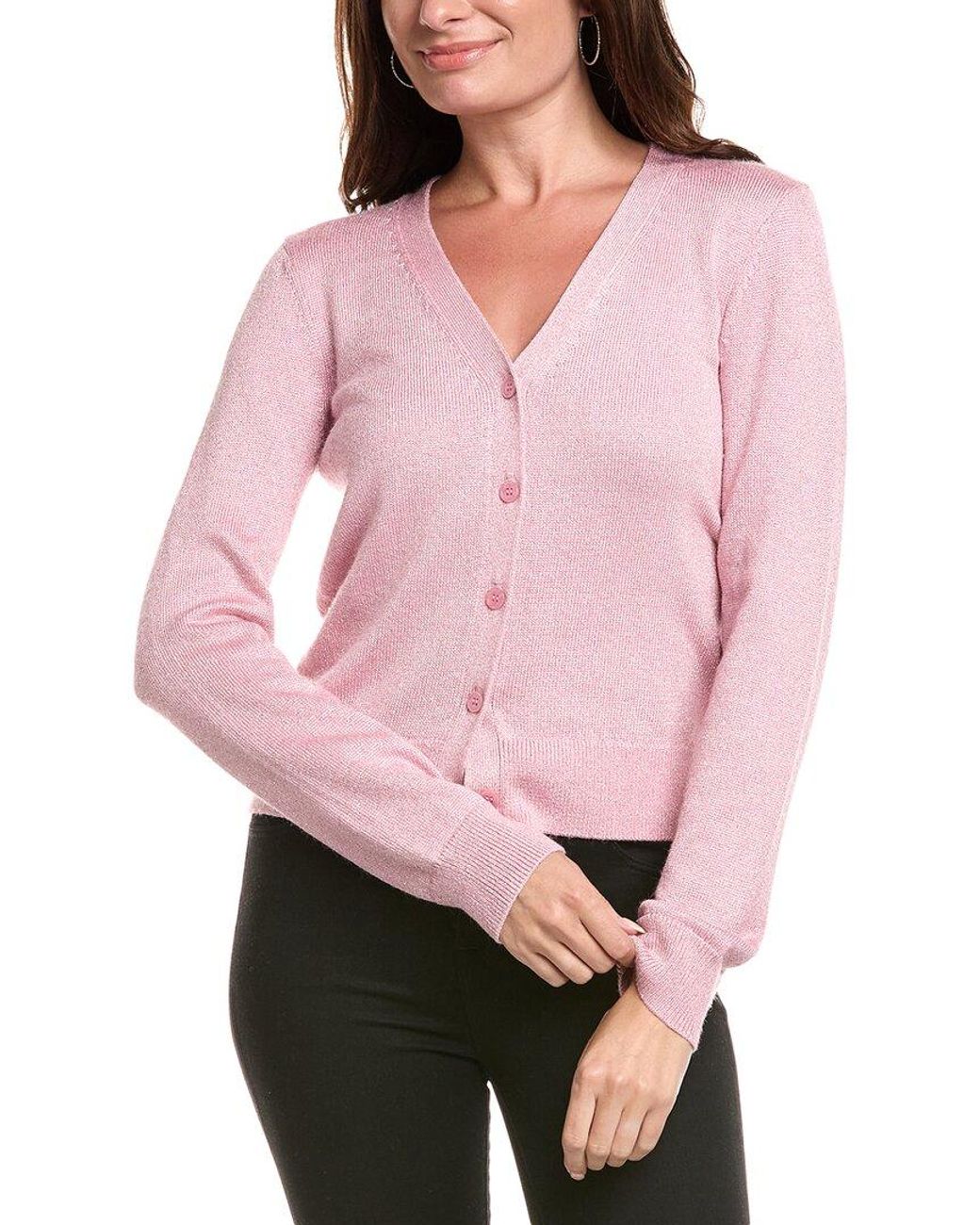 About the brand: Contemporary essentials for everyday wear. Ruiz Cardigan in lychee with ribbed trim Approximately 23in from shoulder to hem Model is 5'10.5 and is wearing a size small. Measurements may vary slightly by size. Button front 54% viscose, 22% metallic, 14% PBT, 10% nylon Dry clean only Imported Colour: pink