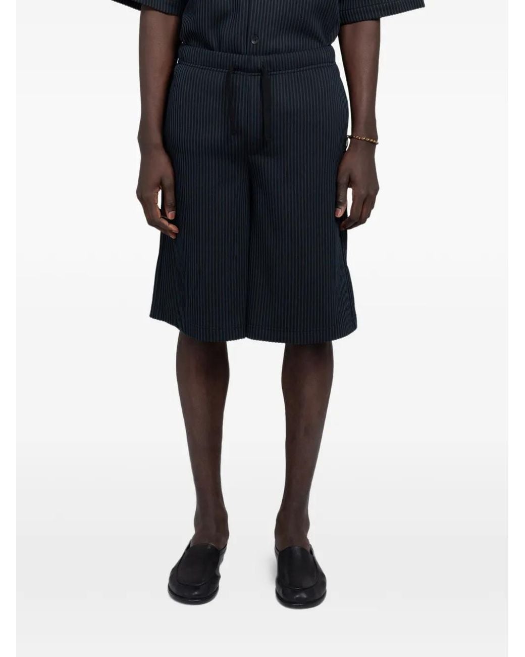 Black pinstripe pattern plissé effect elasticated drawstring waistband two side slit pockets rear patch pocket wide leg Size: S. Gender: Male. Material:Fabric. Colour: blue