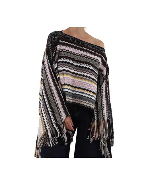 Missoni Asymmetric Knit Poncho is a statement layering piece that combines a fluid silhouette with distinctive fringed detailing. Its asymmetric cut and dropped-shoulder design make it ideal for contemporary casual-chic outfits. Key attributes: Multicolour | Multicolour | Wool blend | Soft feel | Warmth | Comfortable wear | Sleeveless design | Dropped shoulders | Easy to layer | Asymmetric cut | Applied logo | Fluid silhouette | Fringed profile | Dimensions & fit: Comfortable fit | Fluid silhouette | Asymmetric cut for movement | Composition & care: 86% Wool | 9% Viscose | 5% Polyester Colour: black