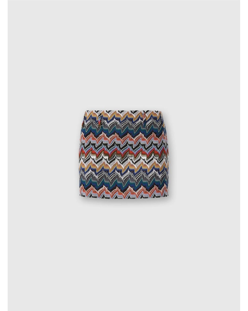 The iconic Missoni motif is reinterpreted in a fresh and contemporary way in this bold women’s mini skirt. The raschel lace evokes the famous chevron design, reinterpreted with a youthful and dynamic touch. The viscose and wool blend yarn gives structure to the garment, enhancing its refined texture.