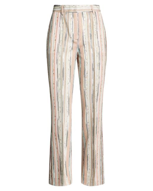 MISSONI. bootcut trousers, knitted, metallic, lightweight knit, signature print, no appliqués, high waisted, regular fit, zip fastening, hook fastenings, slit pocket, hand wash or dry clean, do not bleach, do not tumble dry. 83% Viscose, 17% Metallic fiber.