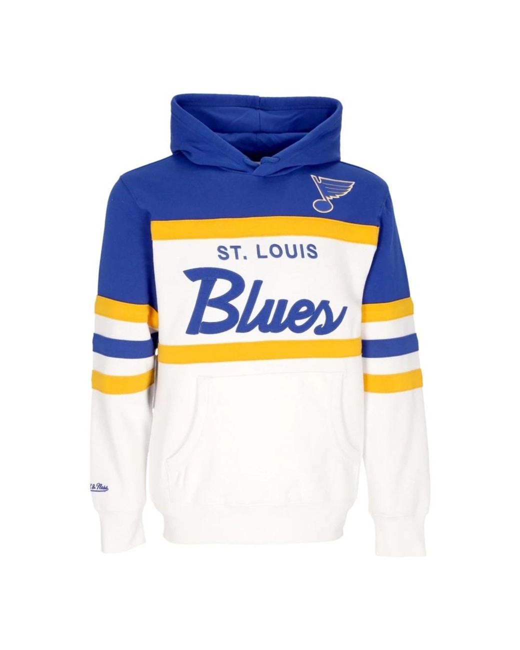 Stay warm and stylish in this mens long-sleeved Mitchell Ness hoodie, featuring an adjustable hood with drawstring and a front kangaroo pocket. Celebrate the St. Louis Blues Hockey Team with the team logo sewn on the front and a patch applied on the left side. The Mitchell Ness logo is embroidered on the right sleeve. Made of 80% cotton and 20% polyester. Hand or machine washable. Perfect for any Blues fan! Colour: blue