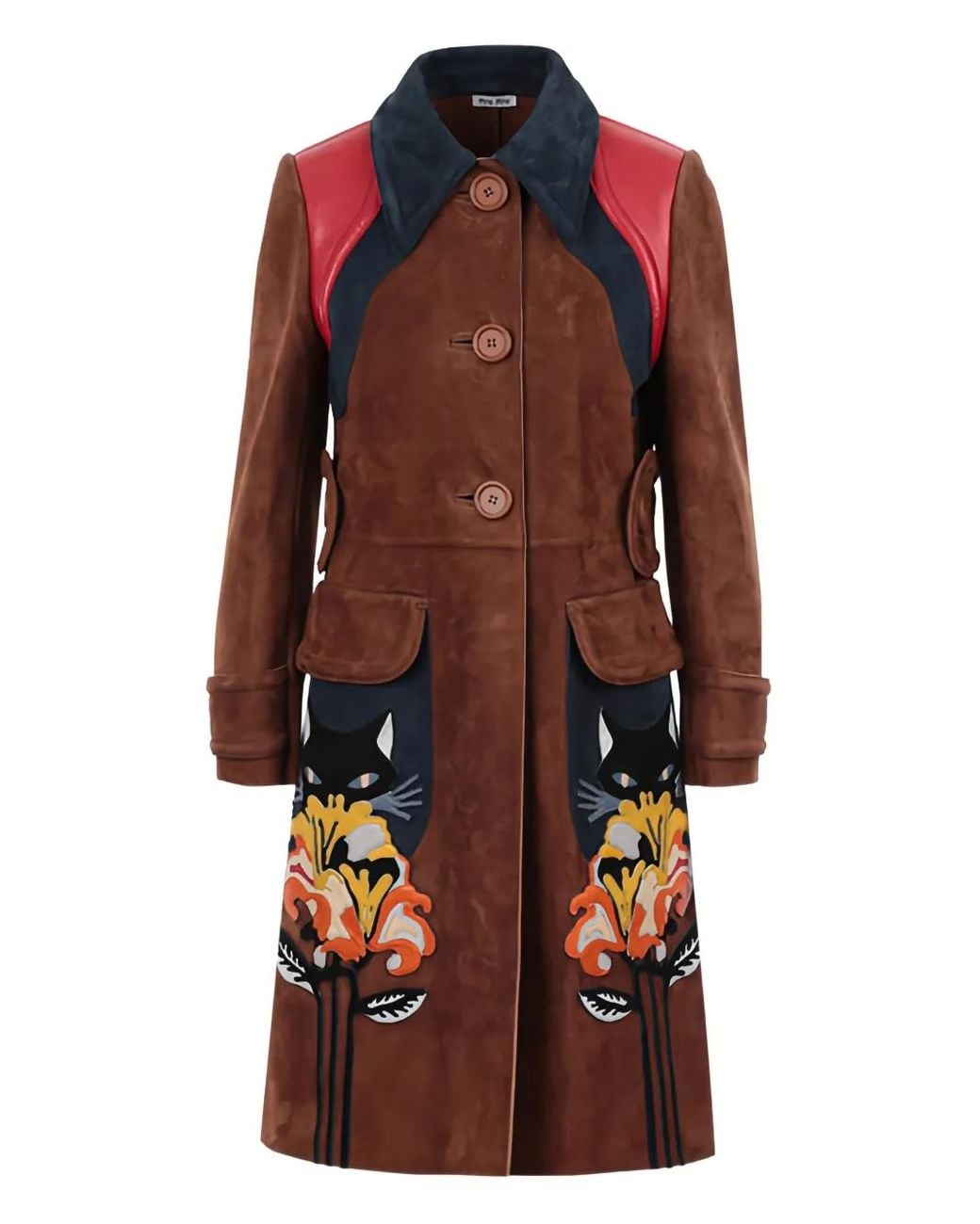 Brown suede leather flower-patch embroidery cat-patch embroidery shirt collar button fastening Size: 42. Gender: Female. Material:Lamb Skin. Colour: red
