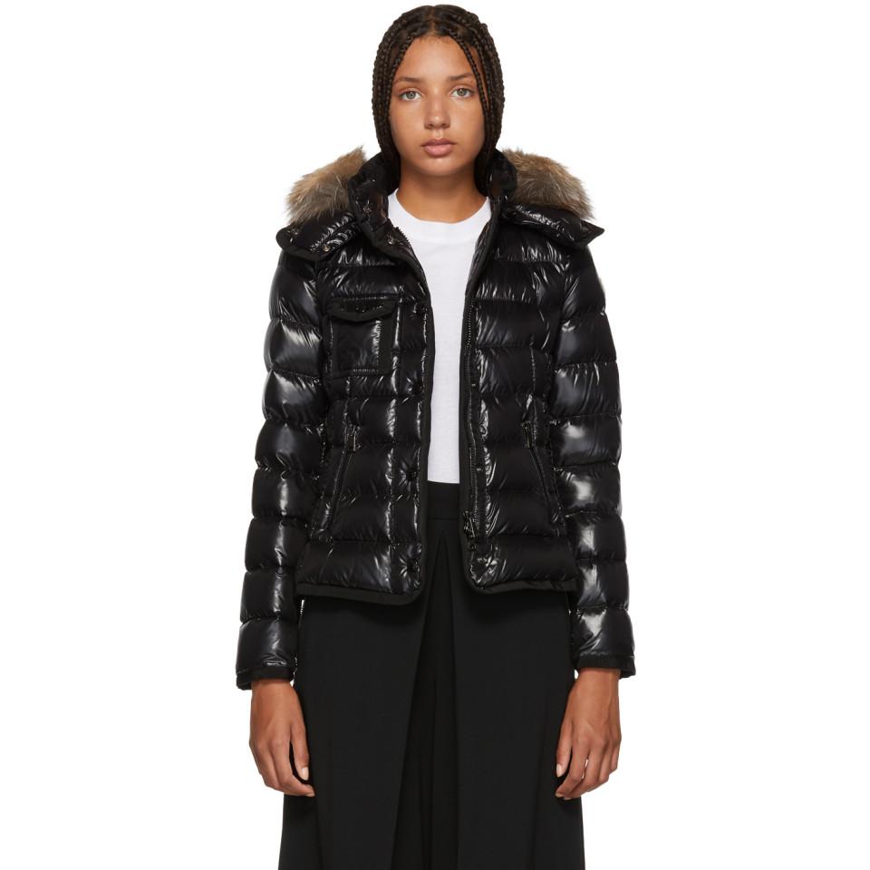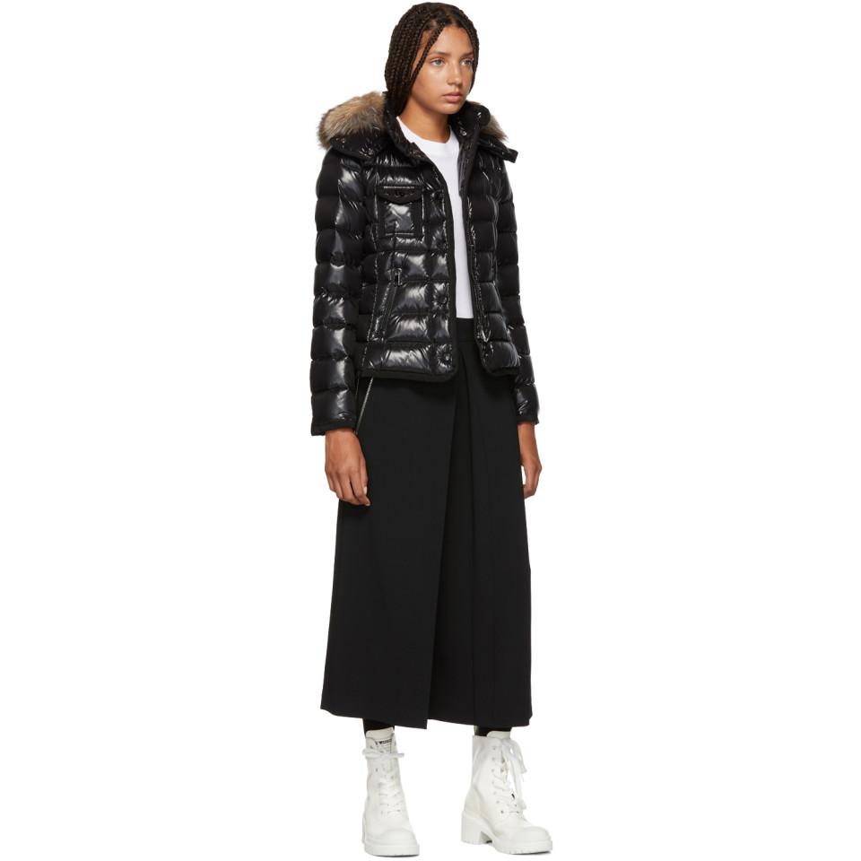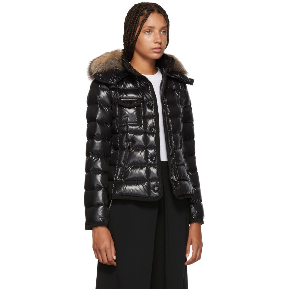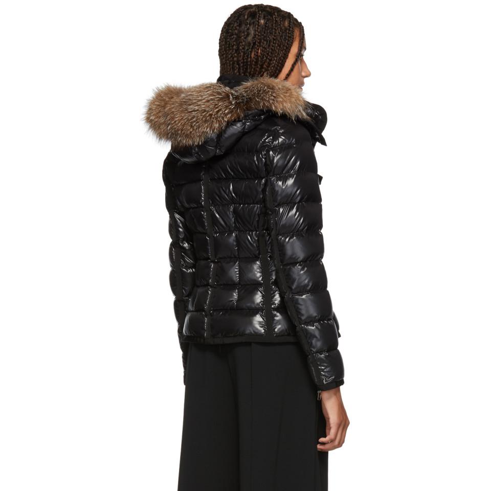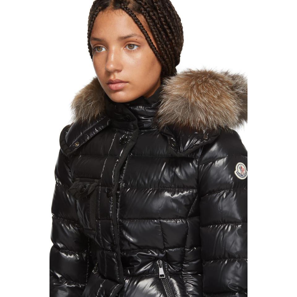 Go to SSENSELong sleeve quilted nylon down-filled jacket in black. Grosgrain trim throughout. Fox fur trim at detachable hood. Stand collar. Concealed zip closure featuring press-stud button placket at front. Flap pockets at chest. Zippered pockets at waist. Signature embroidered logo patch at sleeve. Fully lined. Tonal stitching. Fill: 90% goose down, 10% goose feathers. Trim: fox fur. Colour: black