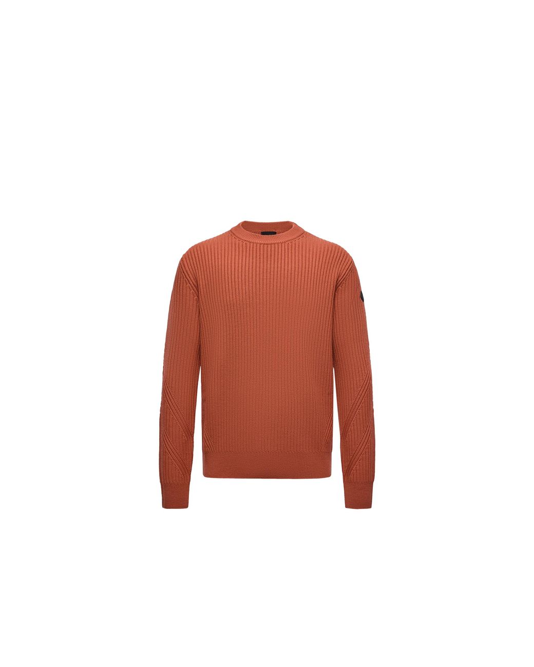 Inspired by the thrilling realm of motorsports, this crew neck jumper echoes the lines of drivers' uniforms through the knitting pattern. The design is crafted from wool, proving warmth and softness. Brand: MONCLER COLLECTION. Gender: male. Size: L. Color: Orange. Material: BASE FABRIC: 100% Virgin wool
