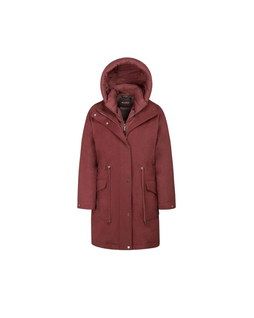Moorer Alimena-Le is a refined parka designed for versatile cold-weather wear, featuring a wool-cashmere outer and a removable down jacket for three-way styling and extra warmth. Key attributes: Redwood | Wool-cashmere blend | Insulating warmth | Down-proof inner shell | Lightweight inner jacket | Removable down jacket | Two-way zip | Drawstring at the waist | Invisible interior pockets | Double-entry flap pockets | Front closure with flap | Large hood | Boudin-quilted inner jacket | Flap pockets with double entry | Dimensions & fit: Comfortable fit | Triple-use: outer parka, removable down jacket, combined use | Composition & care: Exterior: 90% wool, 10% cashmere | Inner shell: super light down-proof silky nylon | Filling: finest goose down | Do not wash. Do not bleach. Iron at a maximum temperature of 110 °C. Dry clean with perchloroethylene. Do not tumble dry. Colour: red