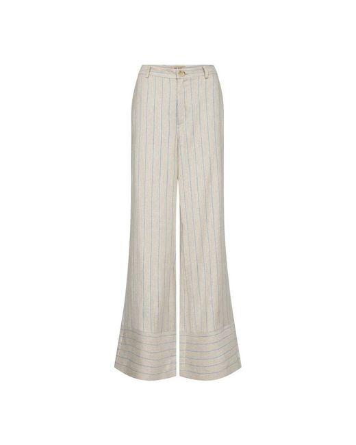 Elegant wide trousers from Mos Mosh with classic pinstripes. The trousers feature a relaxed silhouette and high-quality fabric. · Fit: Regular · Model: Mmmedina Miriam Pant Trousers 172210 Cement · Composition: 52% linen, 46% viscose, 2% elastane / 97% polyester, 3% elastane.