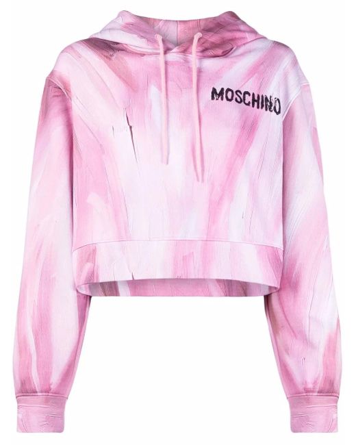 Pink/white cotton brushstroke-print cropped hoodie from MOSCHINO featuring drawstring hood, logo print at the chest, long sleeves, cropped and brushstroke print. Size: 42. Gender: Female. Material:Cotton. Colour: pink
