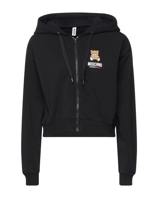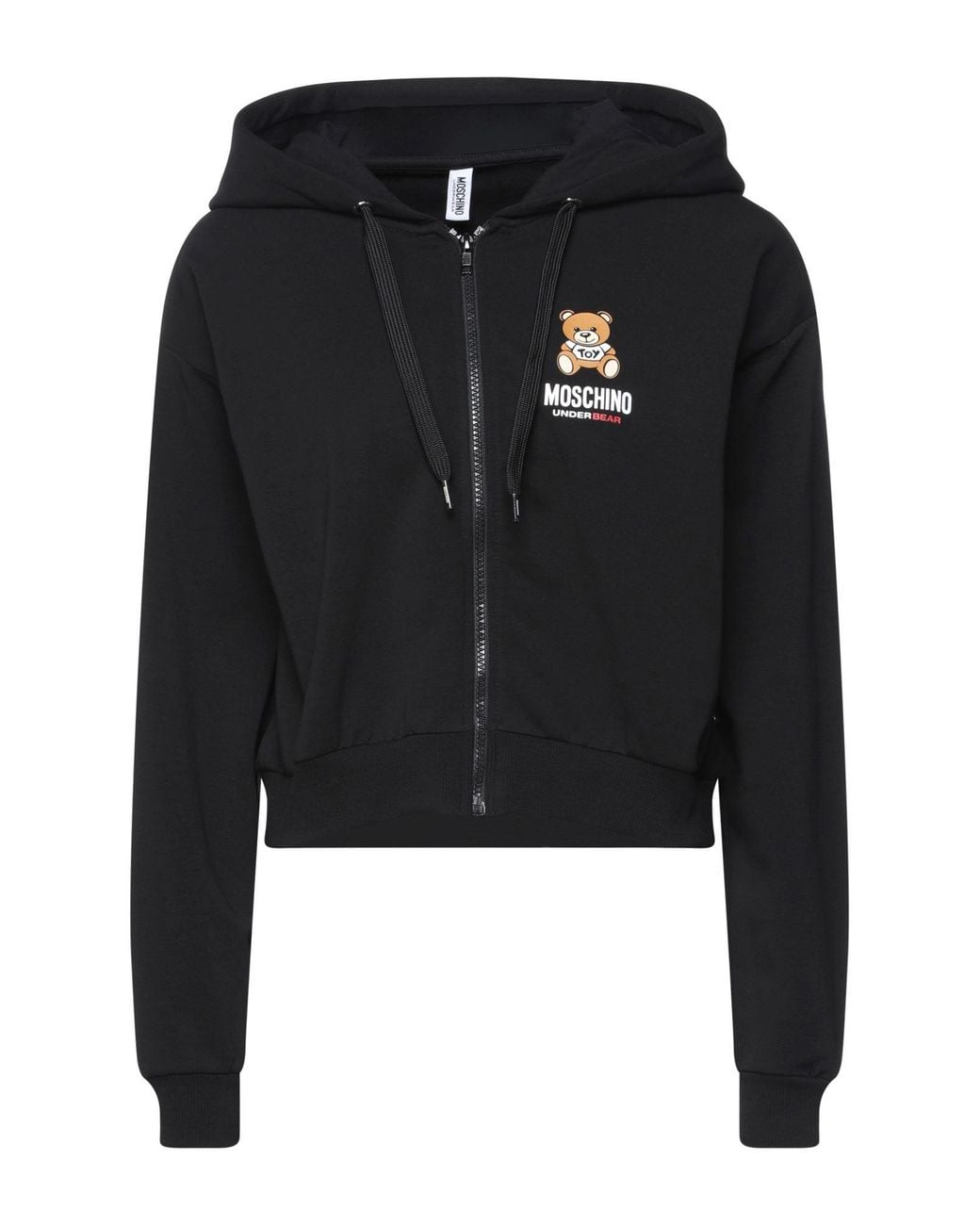 MOSCHINO. fleece, stretchy fabric, plain colour with print, brand logo, hooded, long sleeves, zip fastening, without pockets. 95% Cotton, 5% Elastane. Colour: black