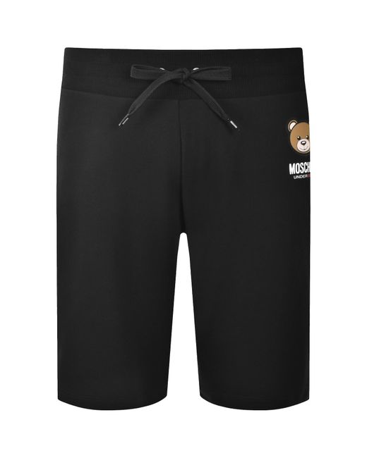 Moschino Underbear Logo Shorts In Black. Jersey shorts with a ribbed drawstring waistband which features branded tips. Two pockets on the hips with an additional pouch pocket on the reverse right. The signature Moschino bear logo is featured on the left thigh with a logo pinch tag on the left side seam. 94% Cotton 6% Elastane. Colour: black
