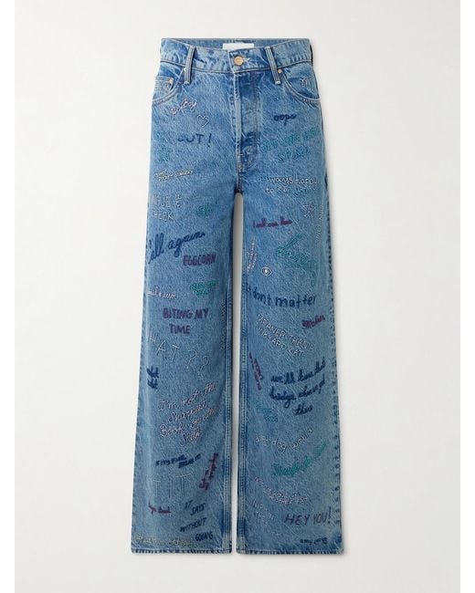 Women's Blue Double Dip Nerdy Embroidered Mid-Rise Wide-Leg Jeans