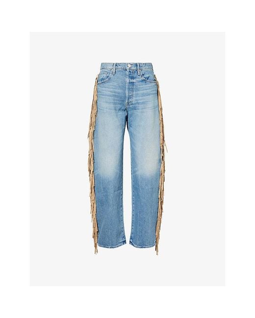 MOTHER denim jeans100% cottonButton and button-fly fasteningRegular fit, high rise, wide straight leg, belt loops, five pockets, fringing at side seams, embroidered brand logo at back pocketsMachine wash coldMade in USATrue to sizeSize 26: rise 12in / 30.5cm, inside leg 32in / 81.3cm, leg opening 18in / 45.7cmModel is 5ft 10in/1.78m and wears a size 26Midweight, non-stretch Colour: blue