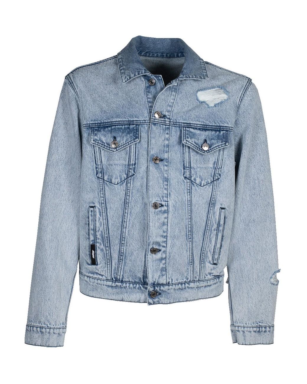 Marbled effect denim jacket in faded effect denim and devor processing on the upper part and on the back left sleeve giant msgm logo printed with motto two upper side pockets with button two lower side pockets front closure with buttons color marbled effect light blue color 100% cotton