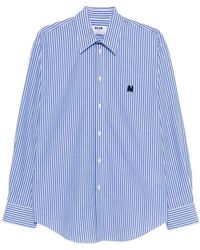 MSGM Men's Blue Striped Rose-Embroidered Shirt