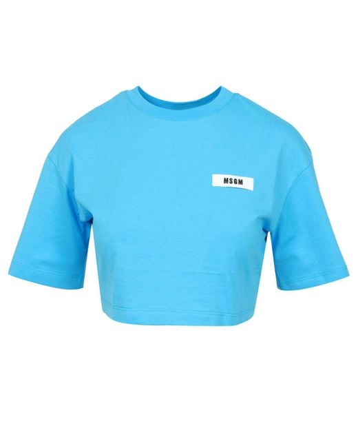- Cotton - Cropped model - Crew neck - Short sleeves - MSGM logo applique on left side chest - Back opening with adjustable drawstring in pigtail - Straight hem - Regular fit Colour: blue