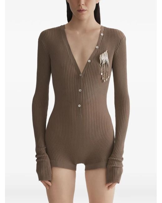 Brown fitted bodysuit fine knit v-neckline extended buttoning ribbed trims Just a reminder that this piece must be tried on over your own garments. Size: XS. Gender: Female. Material:Fabric. Colour: brown
