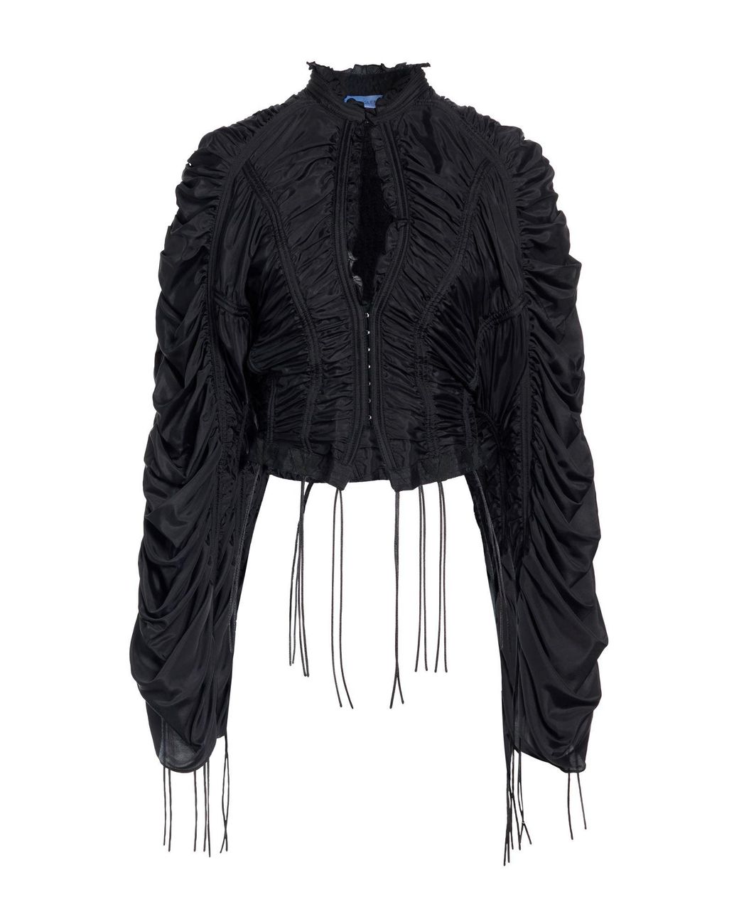 MUGLER. ruched shirt, satin, plain colour with appliqués, gathered, fringes, crewneck, long sleeves, bell sleeves, hook fastenings, dry clean, do not bleach, do not tumble dry, do not iron, amp up the glamour with chic designer party outfits for your next event or fun night out. 75% Viscose, 25% Silk, Polyamide, Elastane.