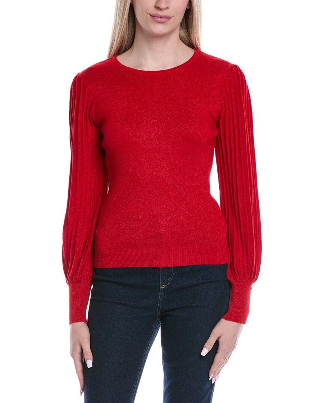 Color/pattern: red Approximately 23in from shoulder to hem Model is 5'10.5 and is wearing a size small. Measurements may vary slightly by size. Design details: ribbed sleeves, round neck, and button accents Slip-on styling 70% rayon, 20% nylon, 10% lurex Hand wash Imported Colour: red