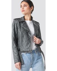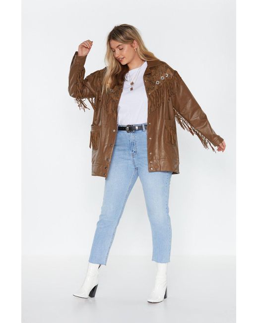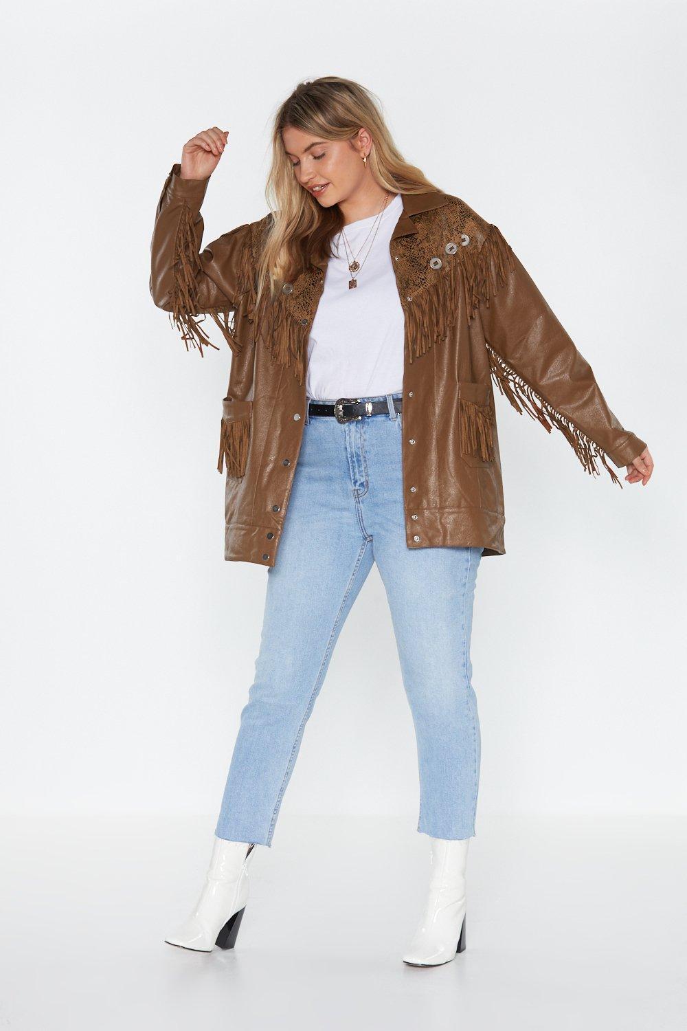 We just can't get enough. This jacket comes in faux leather and features a snap closure, pockets at front, snake print at top, and fringe detailing. Poppy is 5'10" US size 12/ UK size 16. Fabric: 100% Polyurethane Lining: 100% Polyester Backing: 100% Cotton. Model Wears US Size 12/ UK Size 16. Wipe Clean. We've got you. Delivery info.