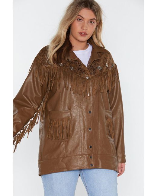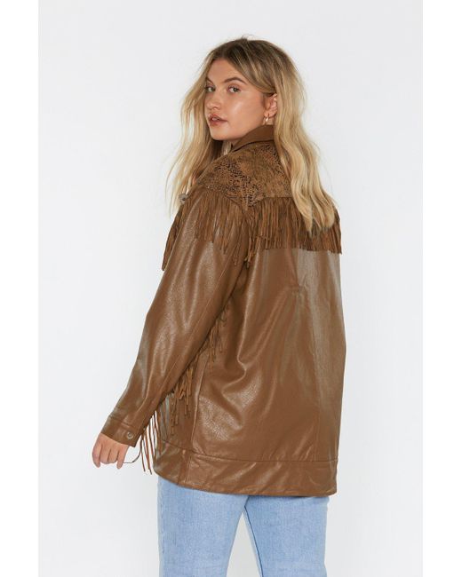 We just can't get enough. This jacket comes in faux leather and features a snap closure, pockets at front, snake print at top, and fringe detailing. Poppy is 5'10"" us size 12/ uk size 16. ". Colour: brown